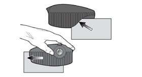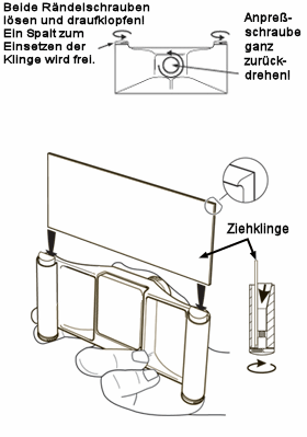 To insert the drawknife, turn the screw of the pressure block in the middle of the holder all the way back. Then loosen the two outer knurled screws made of brass and tap the screw heads with your fingertip. A conical retaining pin will release and create a gap into which the drawknife can be inserted.