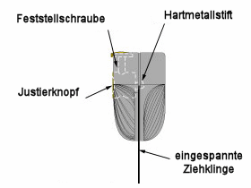 In the sketch on the right, you can see a cross-section. The burnisher sharpening device is pulled over the burnisher blade, which is clamped vertically in a vise or on the workbench. The white dashed line indicates the internal structure of this device. A carbide pin serves to attract the burr. On the left, you can select the desired angle for the burr with the adjustment knob. After the angle is chosen, the set angle is fixed with the locking screw, and then the sharpening device is pulled over the burnisher blade one or more times until the desired burr is achieved. With this device, you have a safe and reliable guide. It is available on our burnisher page.