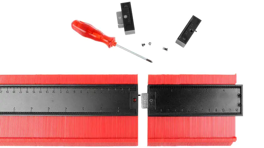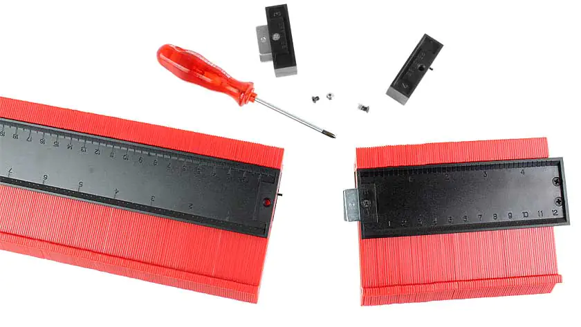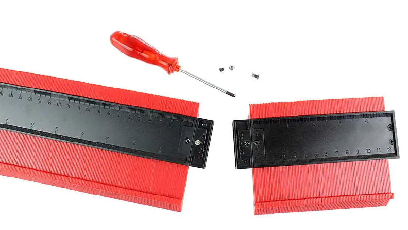 Loosen one screw for the end pieces of the two profile gauges that are to be connected using a cross-slot watchmaker's screwdriver. Make sure that the end pieces are without metal inserts, and for one template, the outer screw, and for the other template, the inner screw. After loosening the end pieces, the slats may fall out. Ensure that this does not happen by handling them carefully. Reassembling the slats is somewhat tedious!