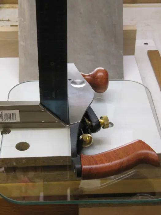 4. Eine weitere unzulängliche Messmethode ist die Benutzung eines ungenauen Winkels auf einer viel zu kleinen Fläche, so dass nur der halbe Schenkel auf der Platte aufliegt. Das Bild suggeriert eine Hobelsohle, die im Bezug auf die Seitenwangen weit außerhalb des rechten Winkels ist.