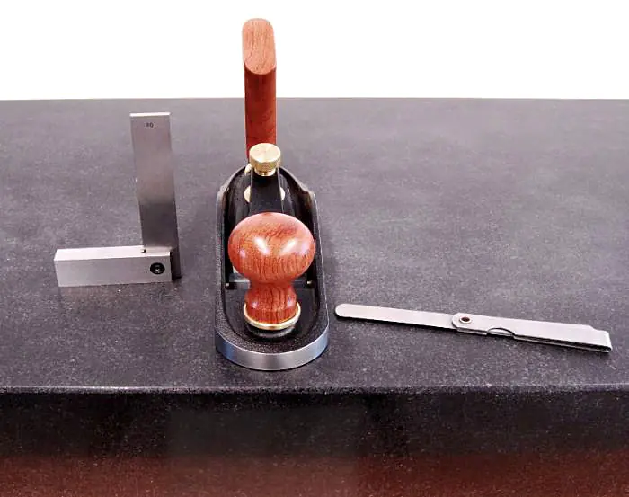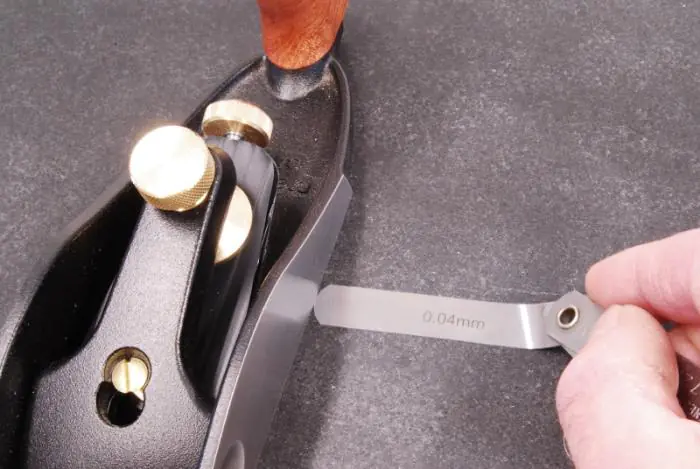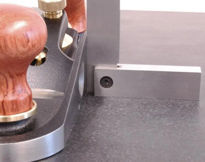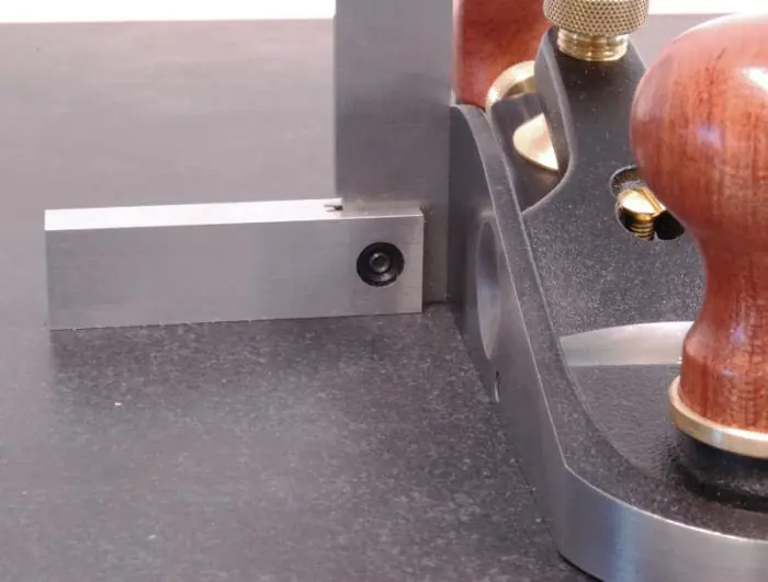 Um die Planheit der Sohle alleine zu messen, stellt man den Hobel auf die Granitplatte und versucht an verschiedenen Stellen, mit einer Fühlerlehre dazwischen zu kommen. Toleranzen wie oben (Gelten für Veritas, bei billigeren Hobeln muß eine höhere Toleranz akzeptiert werden).