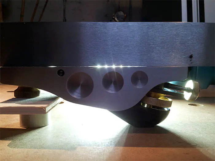 3. Unzulängliche Messmethoden liefern häufig ein falsches Ergebnis oder potenzieren die Ansicht der Abweichung wie zum Beispiel ein Haarlineal. Wir erhalten gelegentlich Fotos mit einem auf die Hobelsohle aufgelegten Haarlineal welches einen deutlichen Lichtspalt zeigt und nahelegt die Abweichung sei erheblich - jedoch ohne präzise Angabe wie breit denn der Lichtspalt ist. Mit dem Haarlineal oder einem Straight Edge sieht man bereits Abweichungen von wenigen tausendstel mm stark fokussiert wie in diesem Bild rechts. Das ist nicht praxisgerecht.