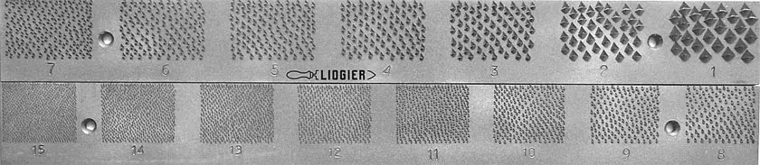 The cuts of the Liogier rasps are numbered from No. 1 to No. 15, with No. 1 being the coarsest and No. 15 the finest. In practice, cuts 4 to 14 are almost exclusively used.
